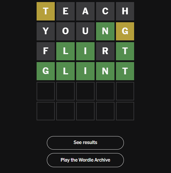 GLINT is a short, sharp word that hides its clarity until the final guesses. With only one vowel and no repeats, it felt deceptively simple while quietly limiting options. Once it clicked, though, everything fell into place. How many guesses did it take you—did you crack it in four, or need all six?