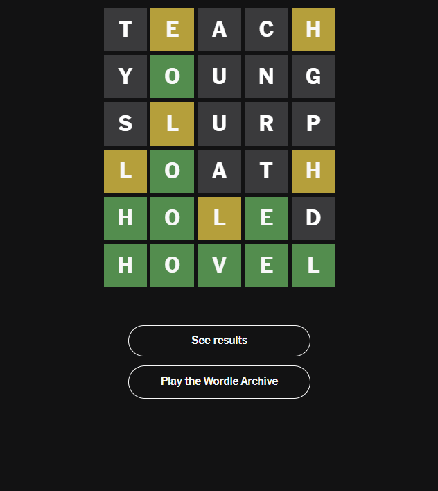Today’s solution, HOVEL, added a rustic flavor to the challenge, especially with its unusual structure and slightly archaic meaning. Many solvers found it trickier than expected due to its rarity. How many guesses did you need?