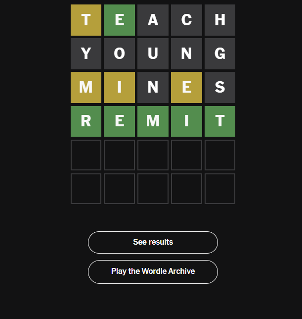 Today’s answer, REMIT, felt approachable but still clever thanks to its formal usage and uncommon everyday frequency. Players who didn’t quickly lean into administrative or transaction-related verbs may have needed extra guesses. How many attempts did it take you?