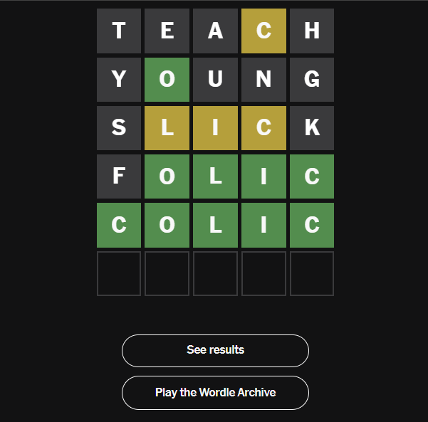 The word colic isn’t one most people use every day, and its unusual letter combination made it easy to second-guess early guesses. The blend of softer consonants and not-so-common vocabulary added an extra layer of difficulty. Did you crack it in four, or did this one take all six tries?