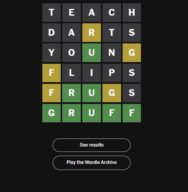 With GRUFF, players had to manage a single vowel and a double consonant, both of which can delay recognition. The word’s tone matches its structure—blunt and heavy. Did you crack it quickly or need every line?