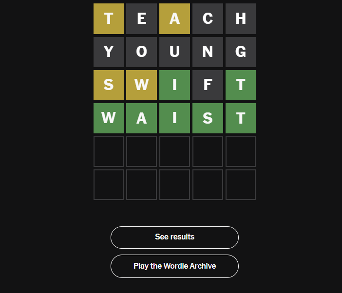 The puzzle played out deceptively simply at first glance, but narrowing down the vowel placement and eliminating repeated-letter options helped crack the grid. The answer? WAIST.