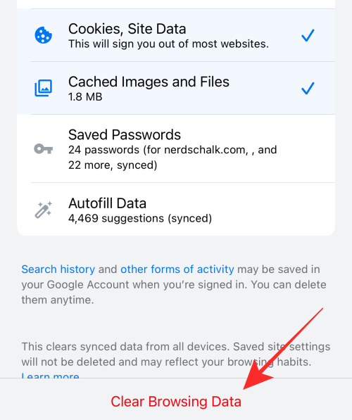 Tap to uncheck the following options — Browsing History, Saved Passowrds, and Autofill Data — if they are in a selected state as shown below.