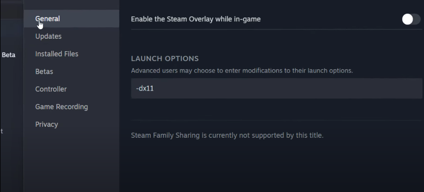 Right-click ARC Raiders in your Steam library, select Properties, and go to the General tab. In the Launch Options field, add -dx11 to force DirectX 11 mode—this bypasses DX12 glitches on older or mid-range GPUs. Save and try launching.