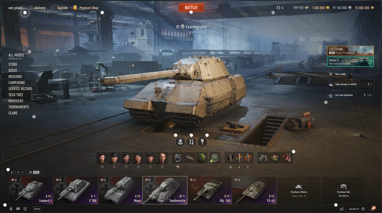 The Garage transforms into a unified tank factory—easier to navigate via its vertical menus and expandable carousel. It includes an armor viewer and a clearer vehicle overview
