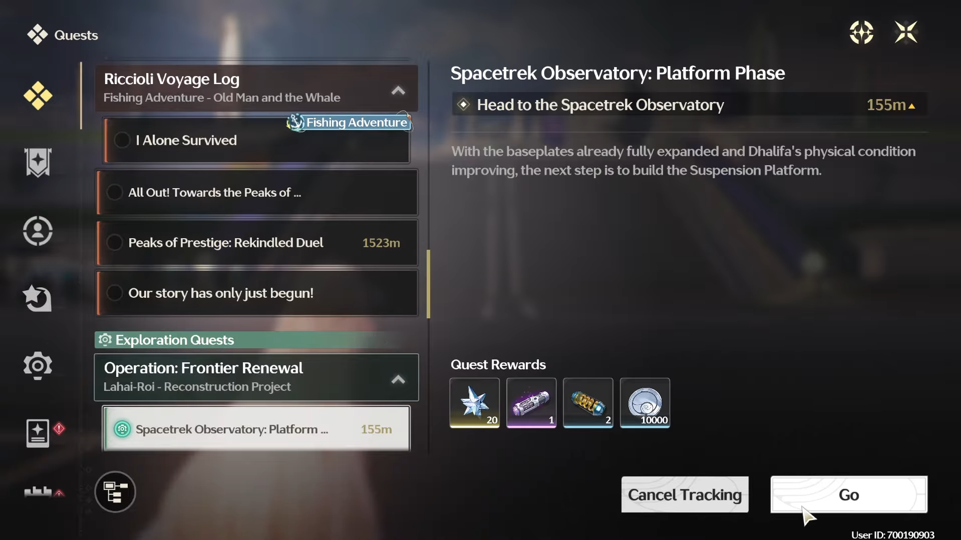 | Spacetrek Observatory Platform Phase | 20 Astrites | 1 Tidal Supply Chest + level-up materials | Progresses the observatory and advances the Lahai-Roi story |