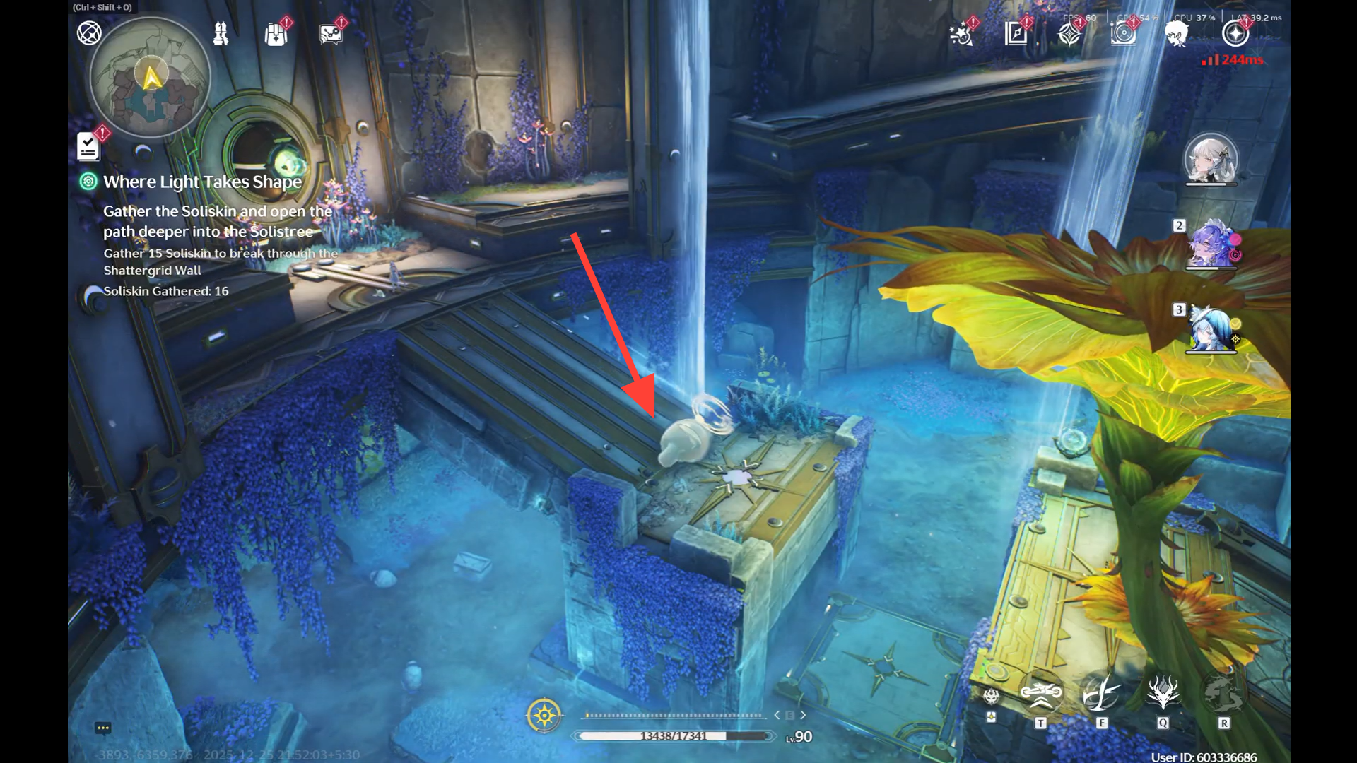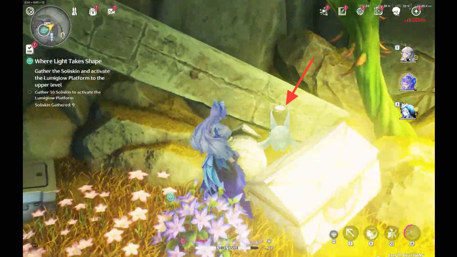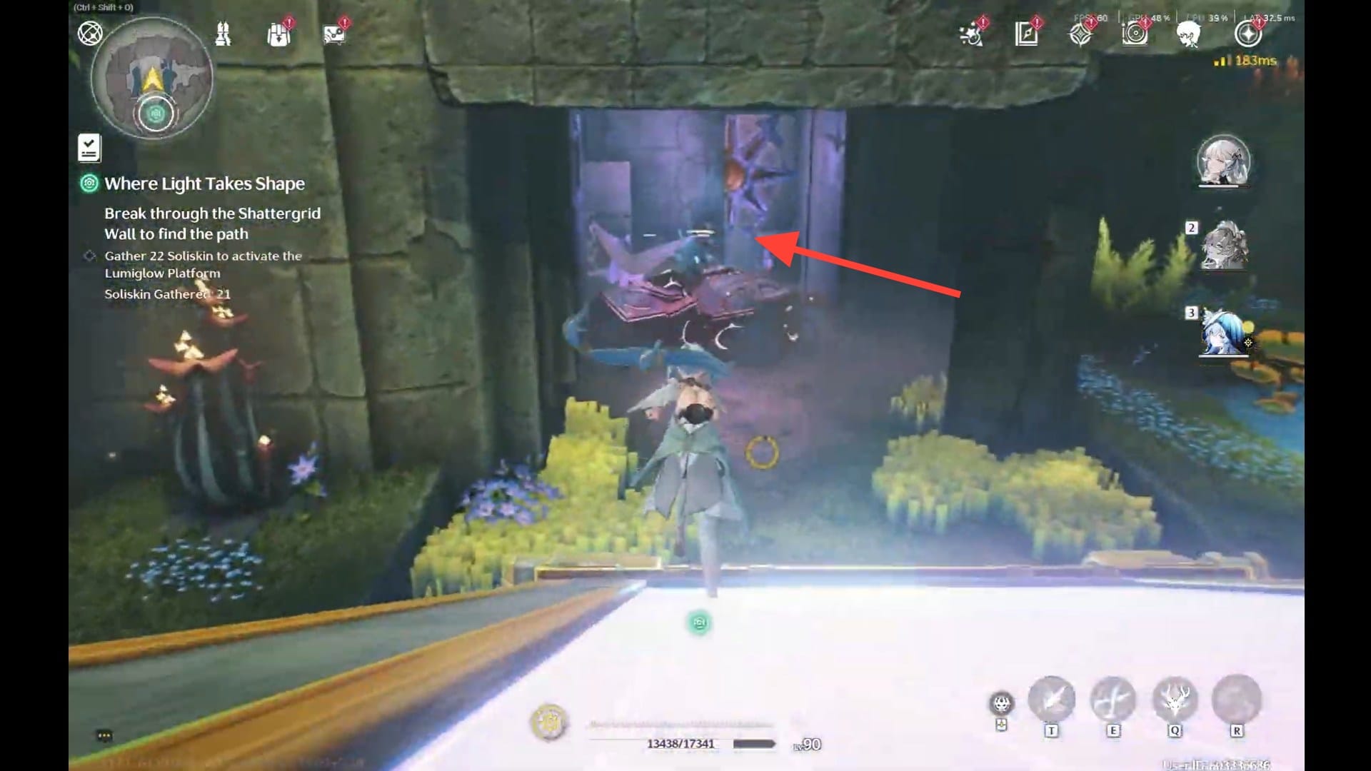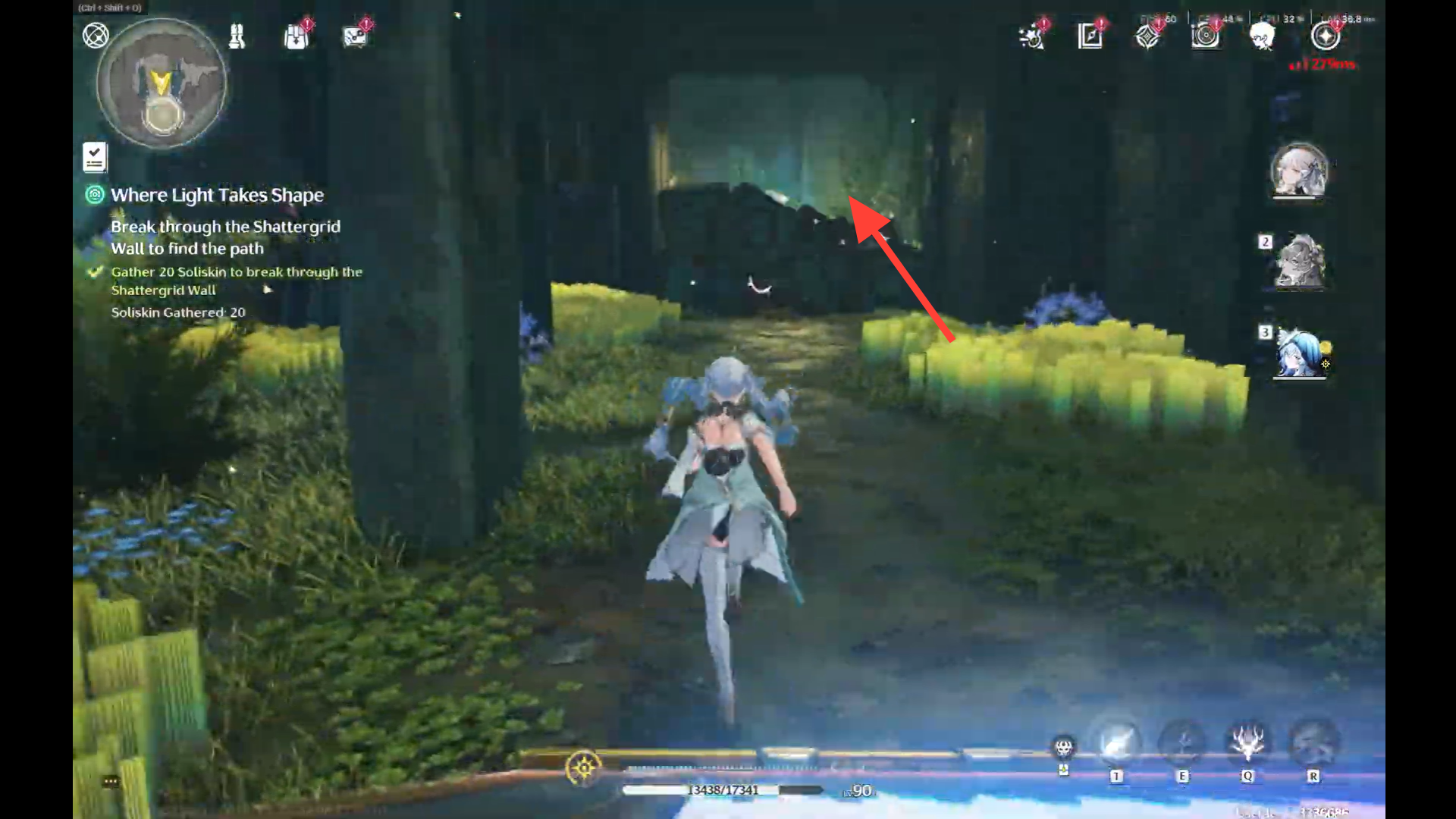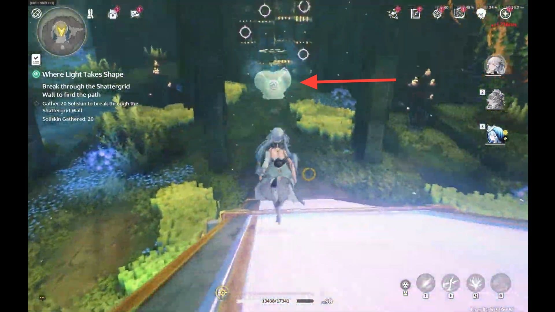 Find 1 more Soliskin to get 15 Soliskins that will help you break the Shattergrid Wall. This Soliskin is sitting right below the yellow glowing flower.