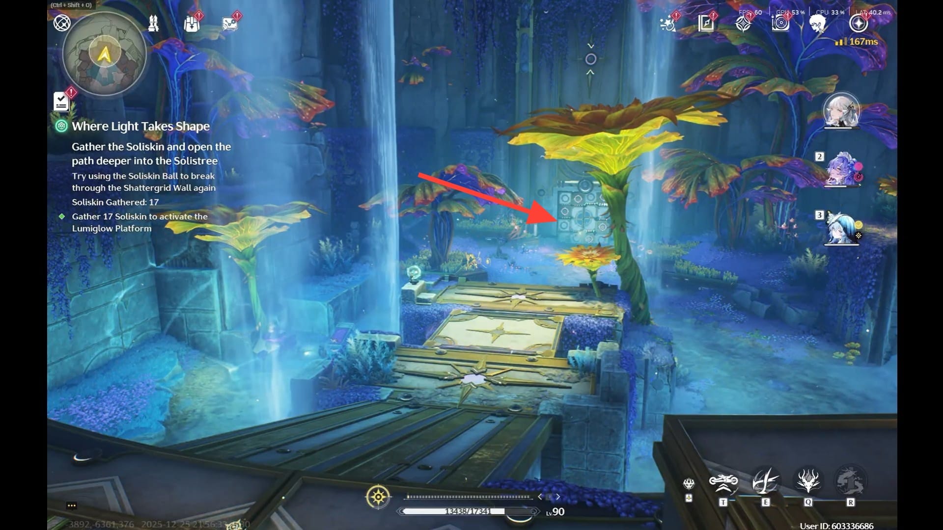 With the help of the Soliskin ball, the Shattergrid Wall breaks. Explore further into Solistree.