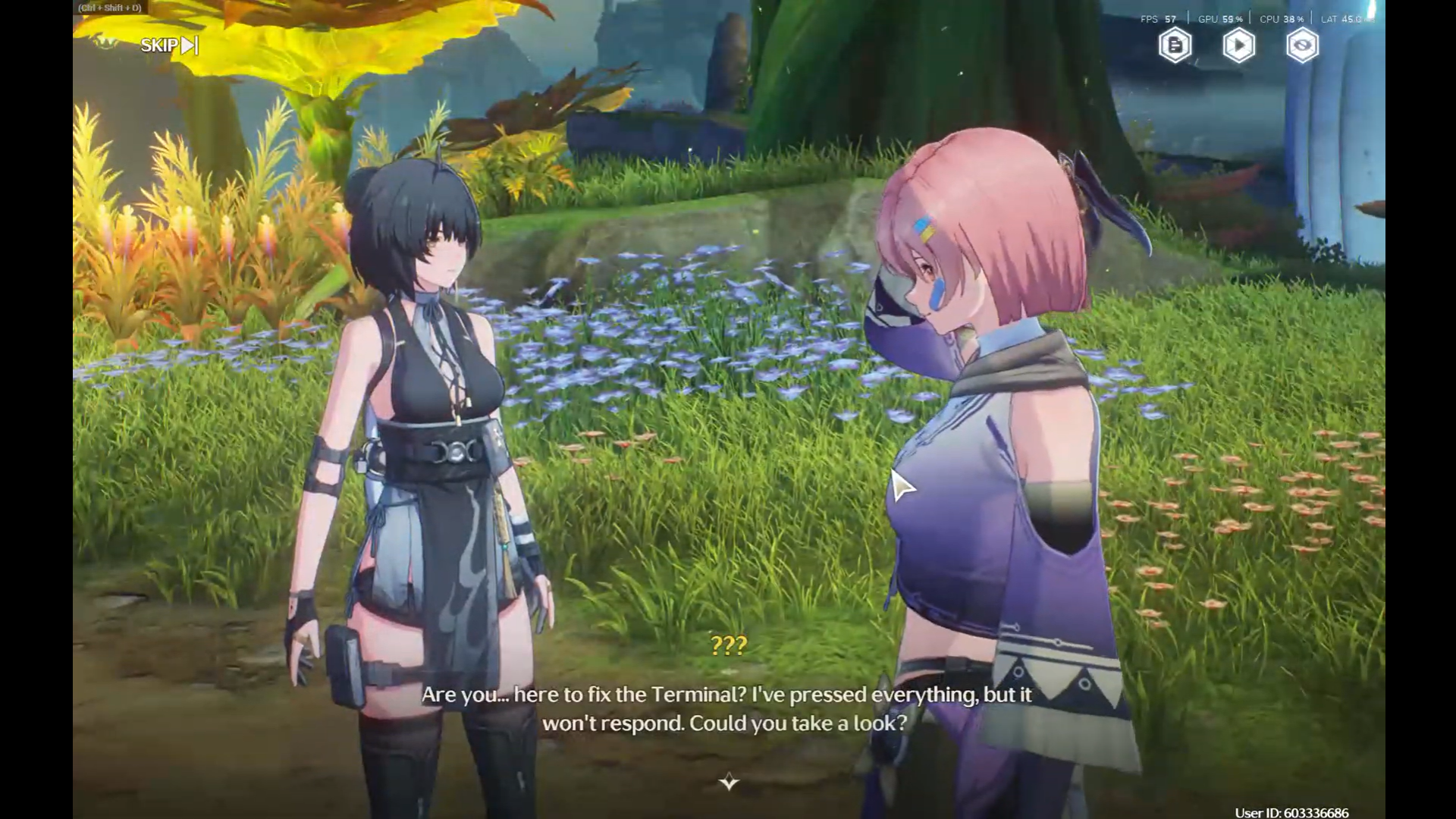 Offer her help to fix the terminal. Then she reveals her name as Minna.