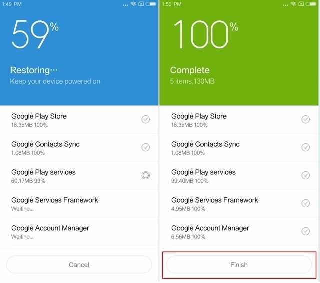 - The restore process will take some time. Once it’s done, you can tap on Finish.