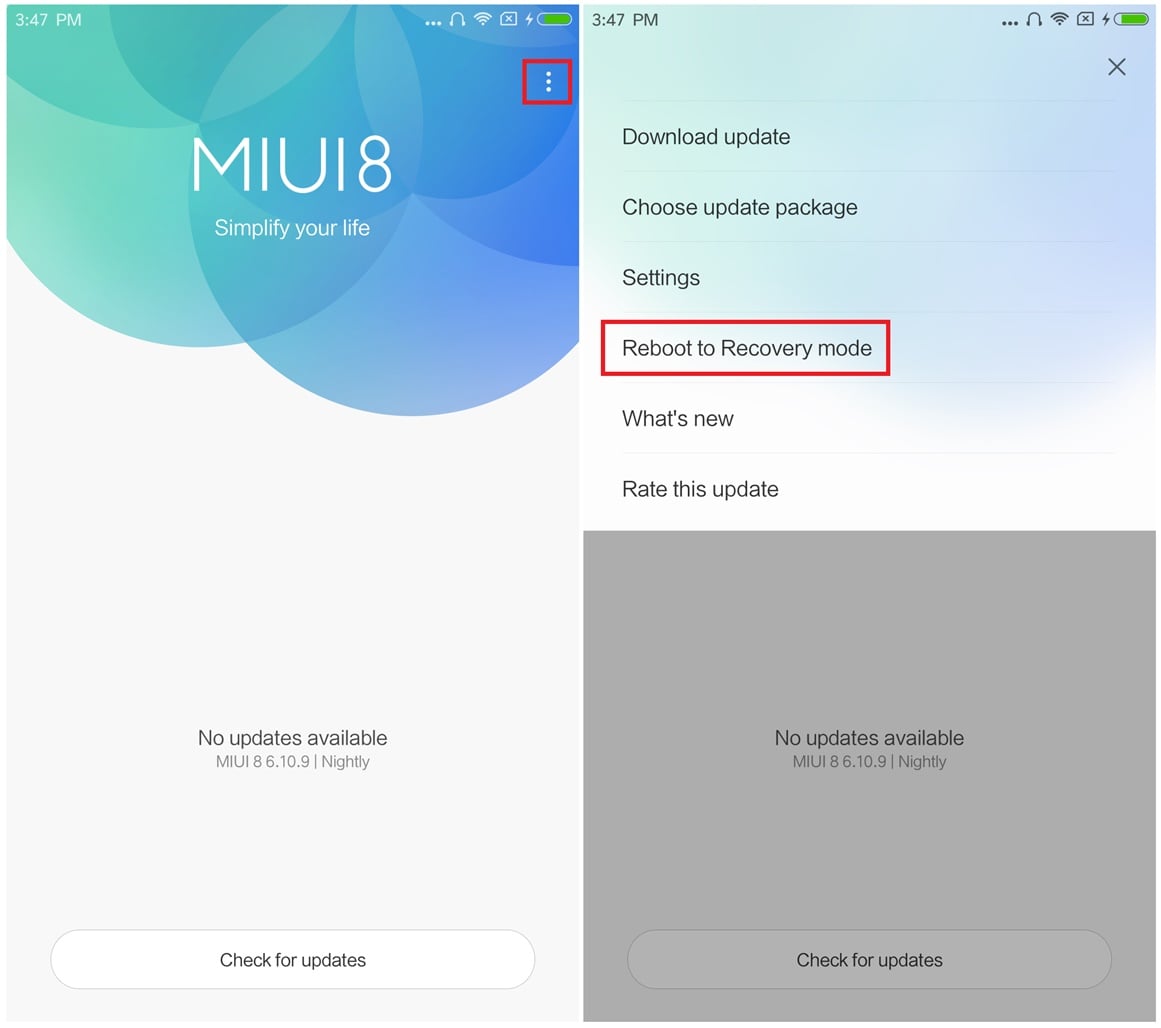 3. Next, you will need to enter into Recovery of the device. The easiest way to get there is to open the Updater app on your smartphone, tap on the three dots on the top right corner and then select Reboot to Recovery mode.