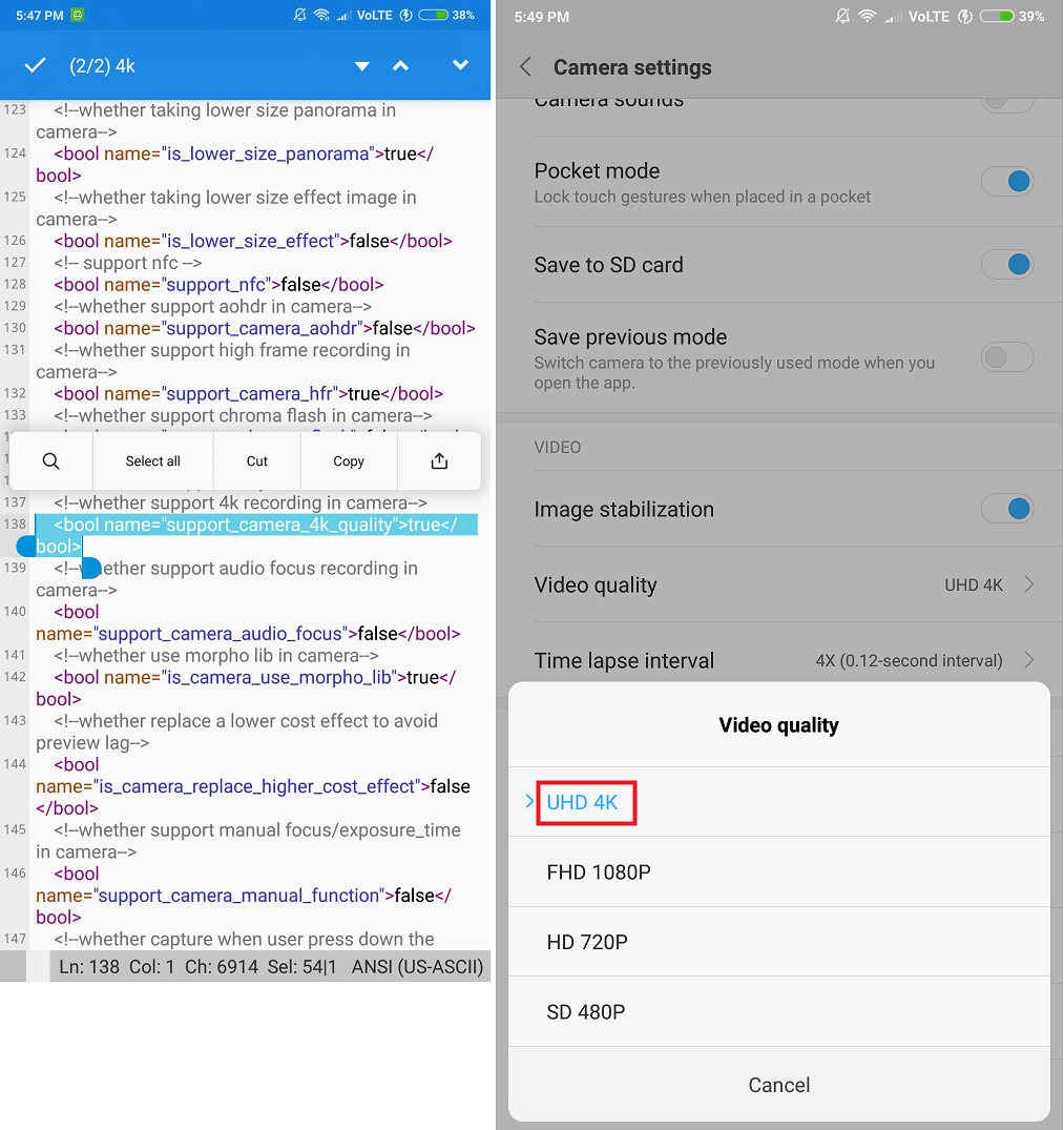 - Locate the line that reads “support_camera_4k_quality”.