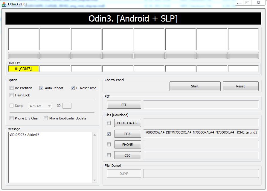 - Important! On Odin, make sure Auto Reboot and F. Reset Time check boxes are selected. Do not touch any other check box or tab or anything, except as was required in step 7 above.