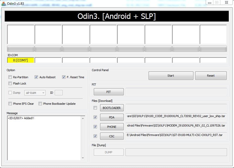 - Important! On Odin, make sure Auto Reboot and F. Reset Time checkboxes are selected. Do not touch any other check box or tab or anything, except as was required in step 8 above.