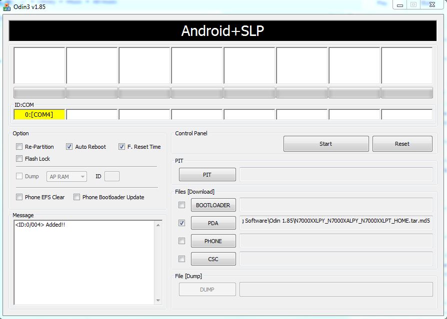galaxy note via Odin 1.85 it was successfully Pass after the reboot i