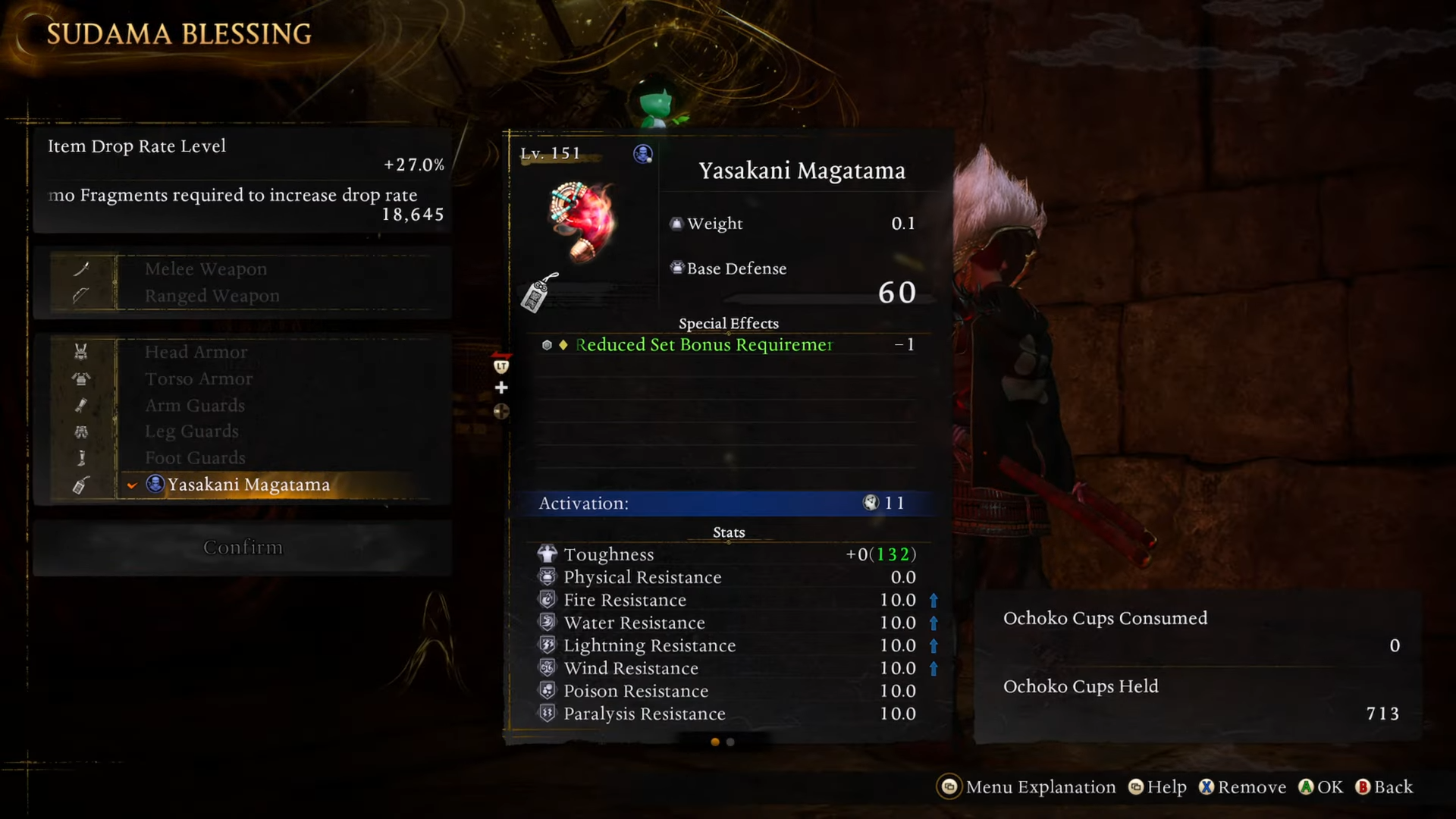 • Boost drops 27%+ with Sudama Blessing on Yasakani, Red Kappa soul cores (item drop rate), and luck gear like Swallowtail set.