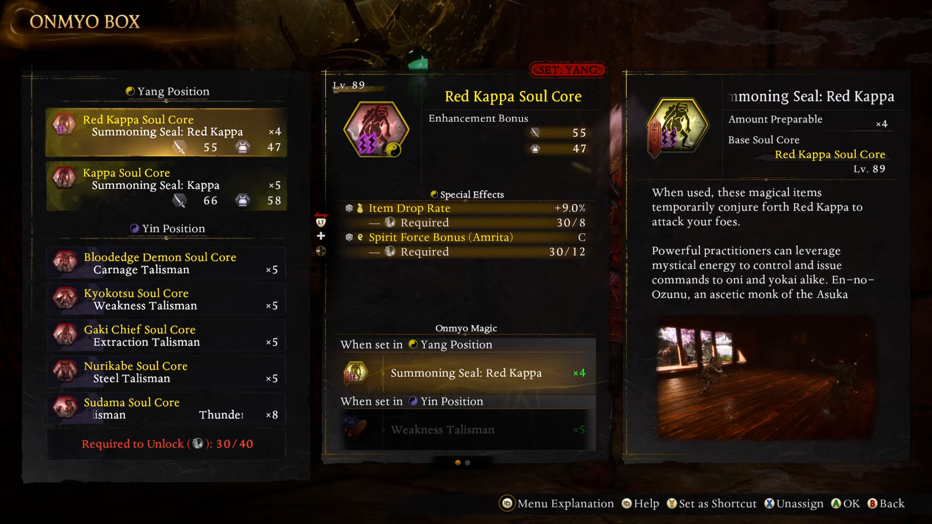 Equip Red Kappa soul cores x2; All-on Guardian Spirit (level 25, +20.8% item drop).