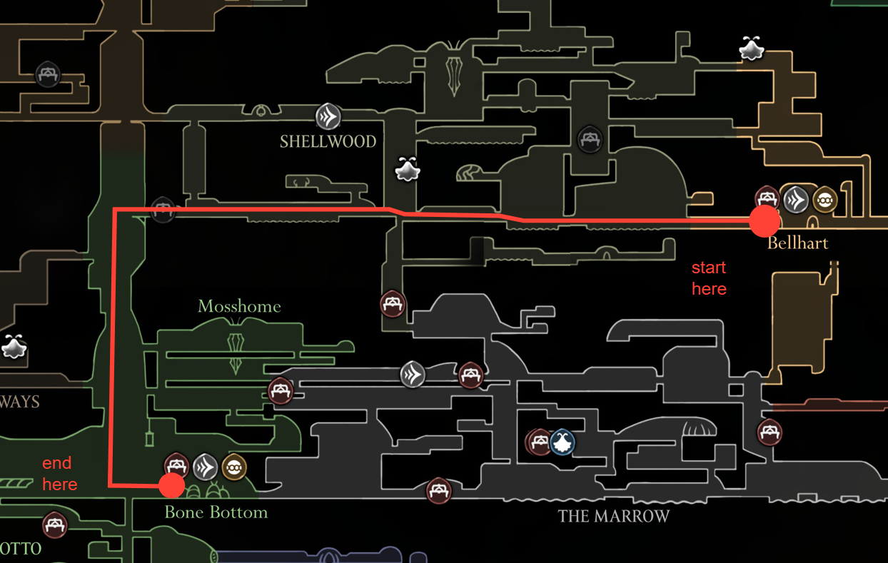 Start in Bellhart, head left through Shellwood’s lower path to avoid upper hazards, then drop directly into Bone Bottom via the main shaft. Use silk-based wall-clinging to bypass enemies. This route takes about 3-4 minutes, allowing minor hits if you’ve opened shortcuts beforehand.