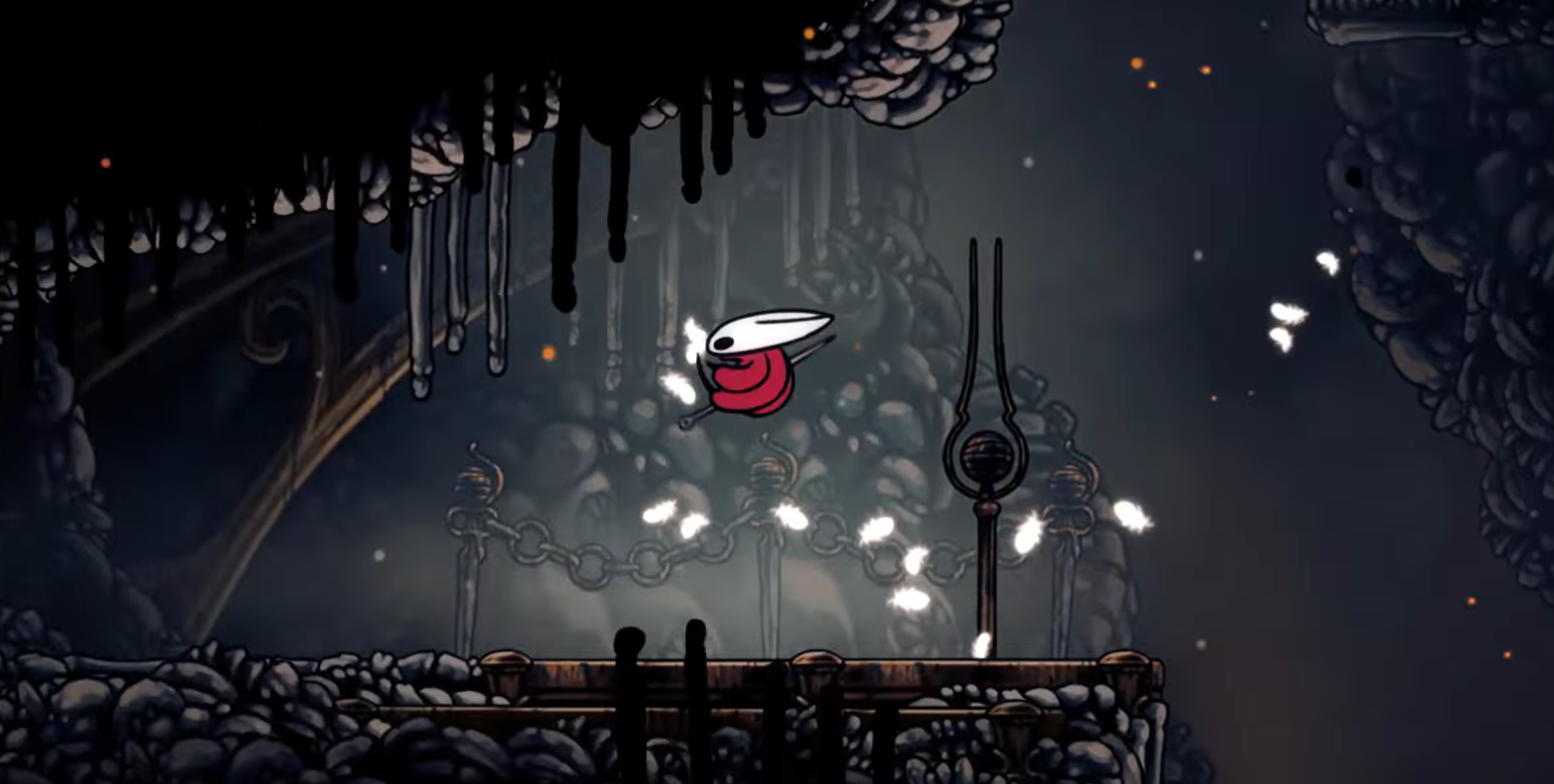 Descend into Bone Bottom via cliff edges and platforms, dodging small enemy swarms like weaverlings.