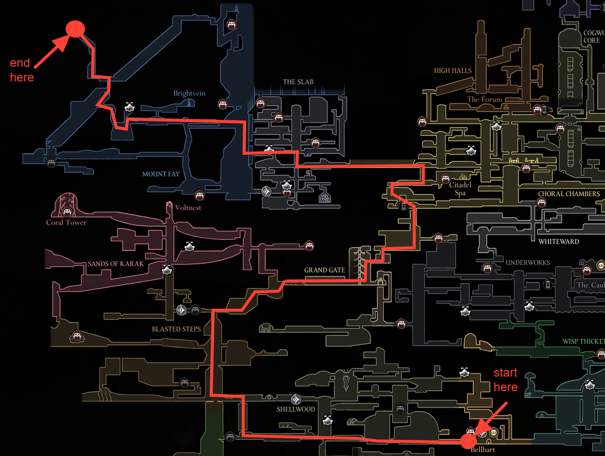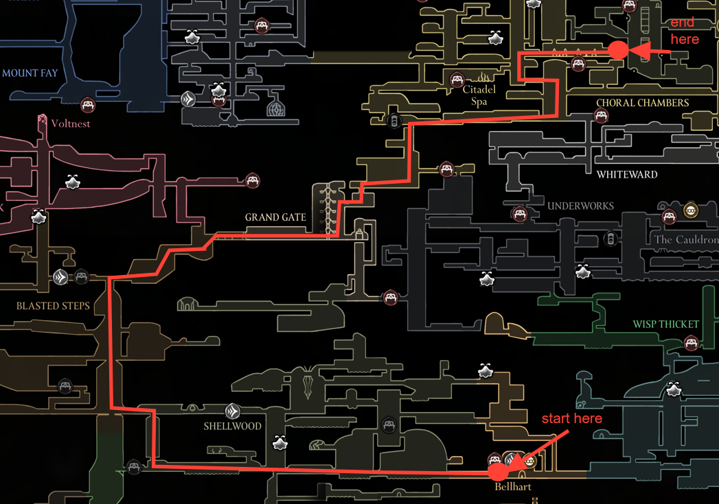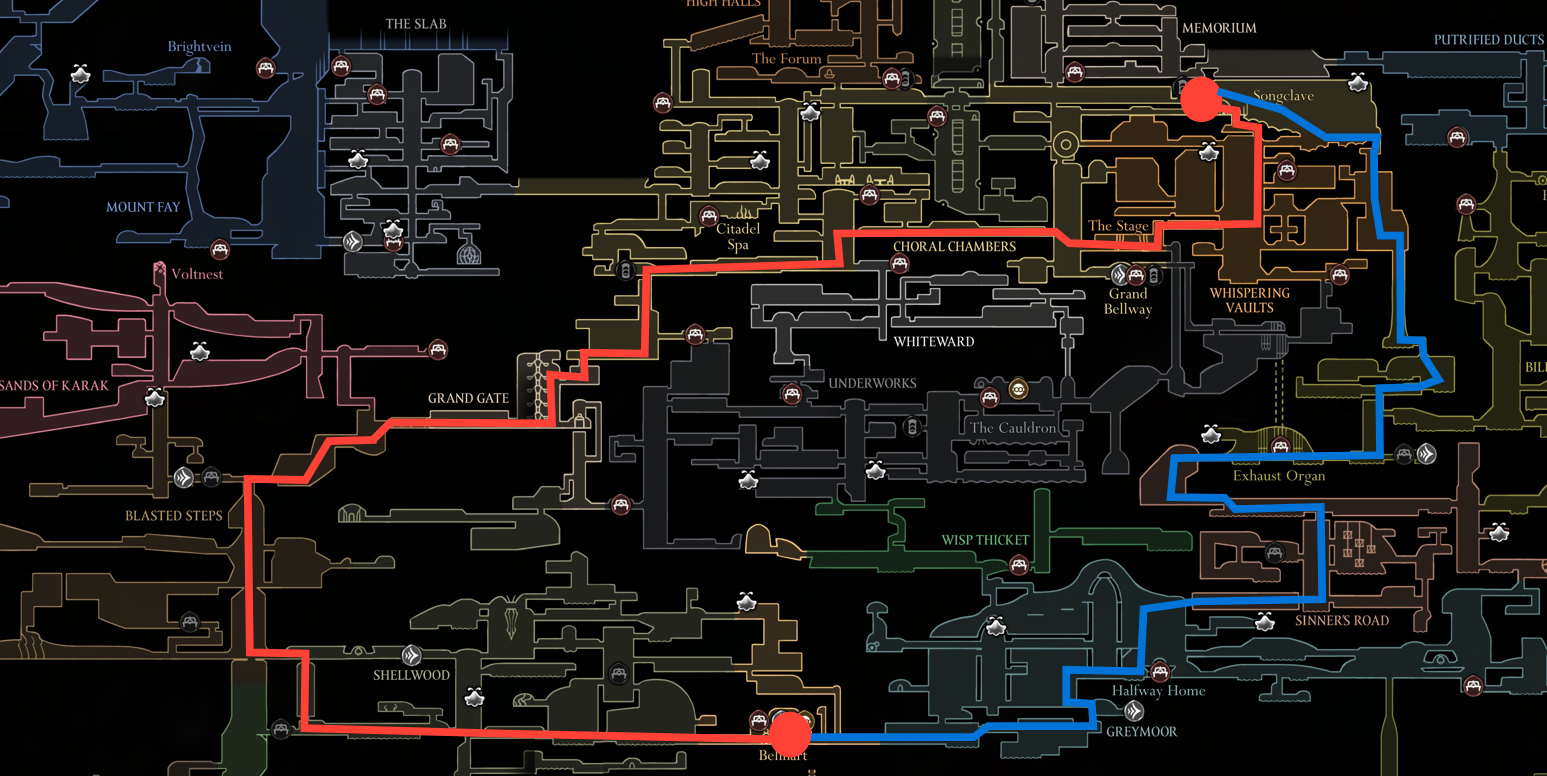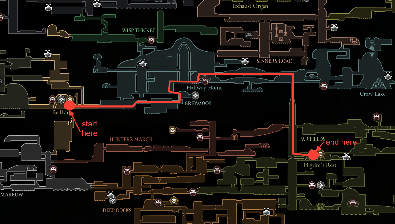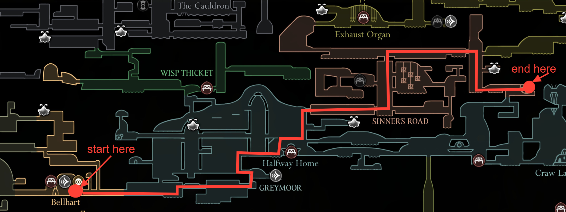 Take Bellhart to Greymoor, then directly to Sinner’s Road, using clawline for quick gap traversal and dodging ground enemies. This path takes roughly 3 minutes with practiced movement.