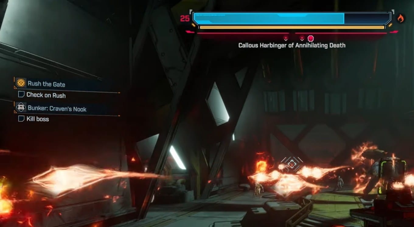 When Callous’s shield glows, brace for a missile attack. Quickly move behind elevated platforms or cover to avoid damage.