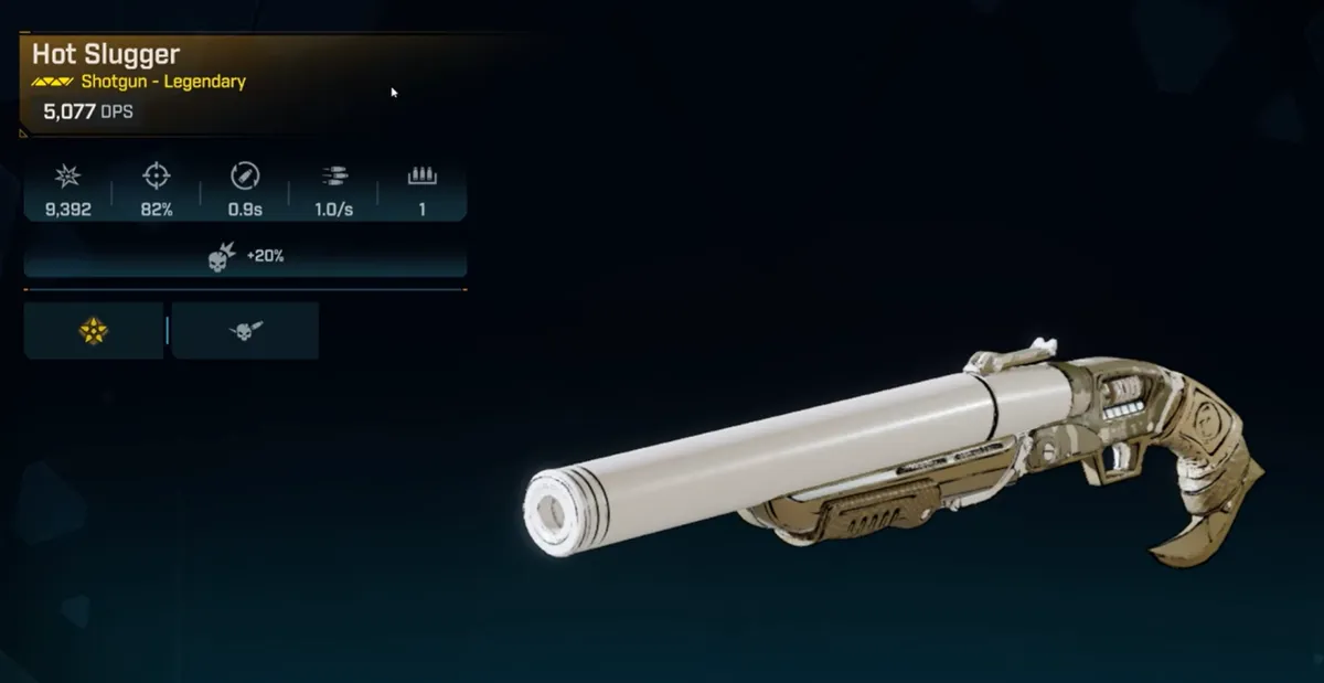 The Hot Slugger shotgun is prized for its slow but heavy slug shot and +30% damage stacking effect that lasts 10 seconds per kill, making it excellent for burst damage and boss fights. It also ricochets critical hits to nearby enemies.