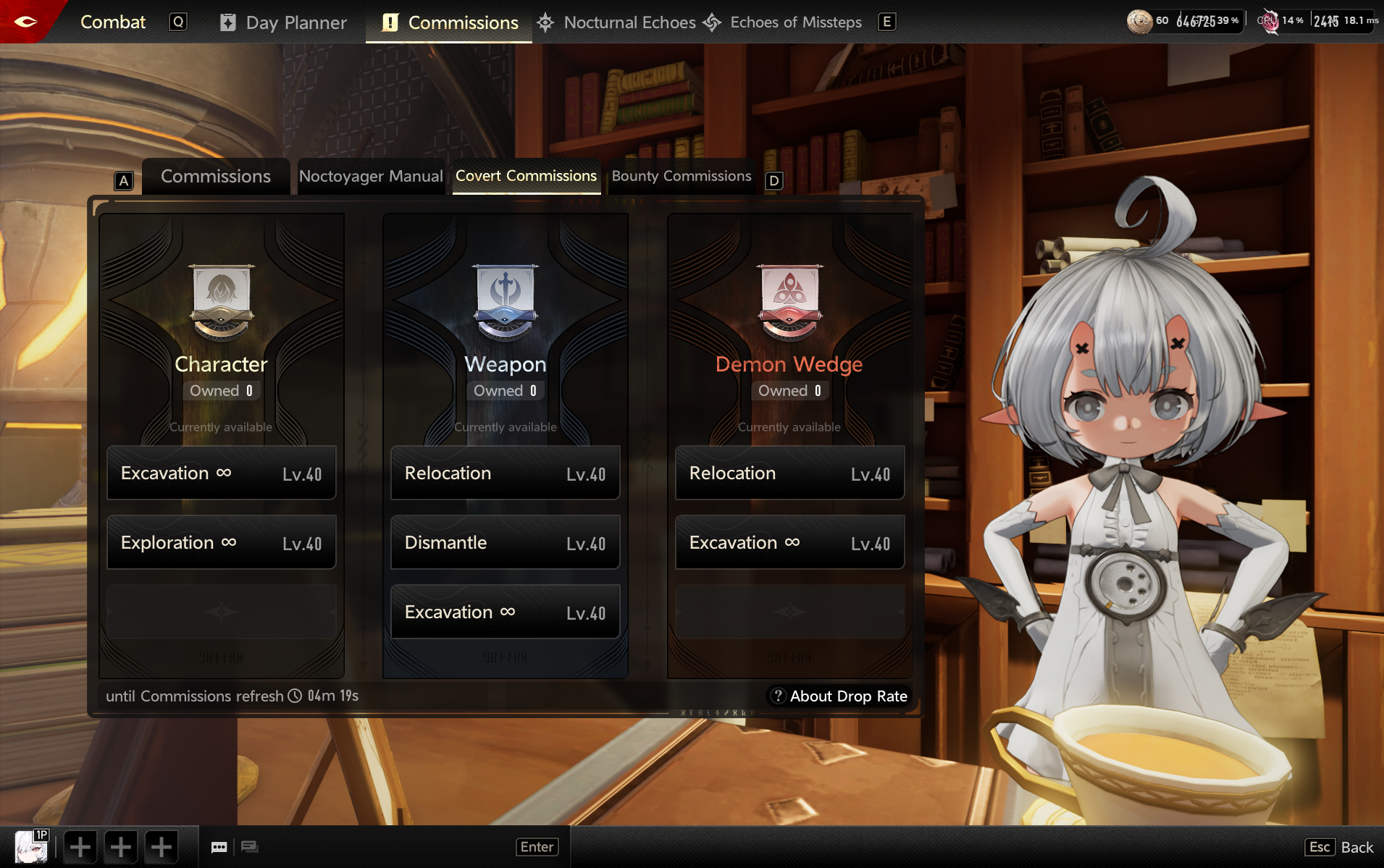 | Covert commissions | Unlocked by completing the side quest "Go, Geniemons!". Enables targeted farming for characters, weapons, and Demon Wedges. No stamina cost, missions rotate hourly, and difficulty scales from level 40. |