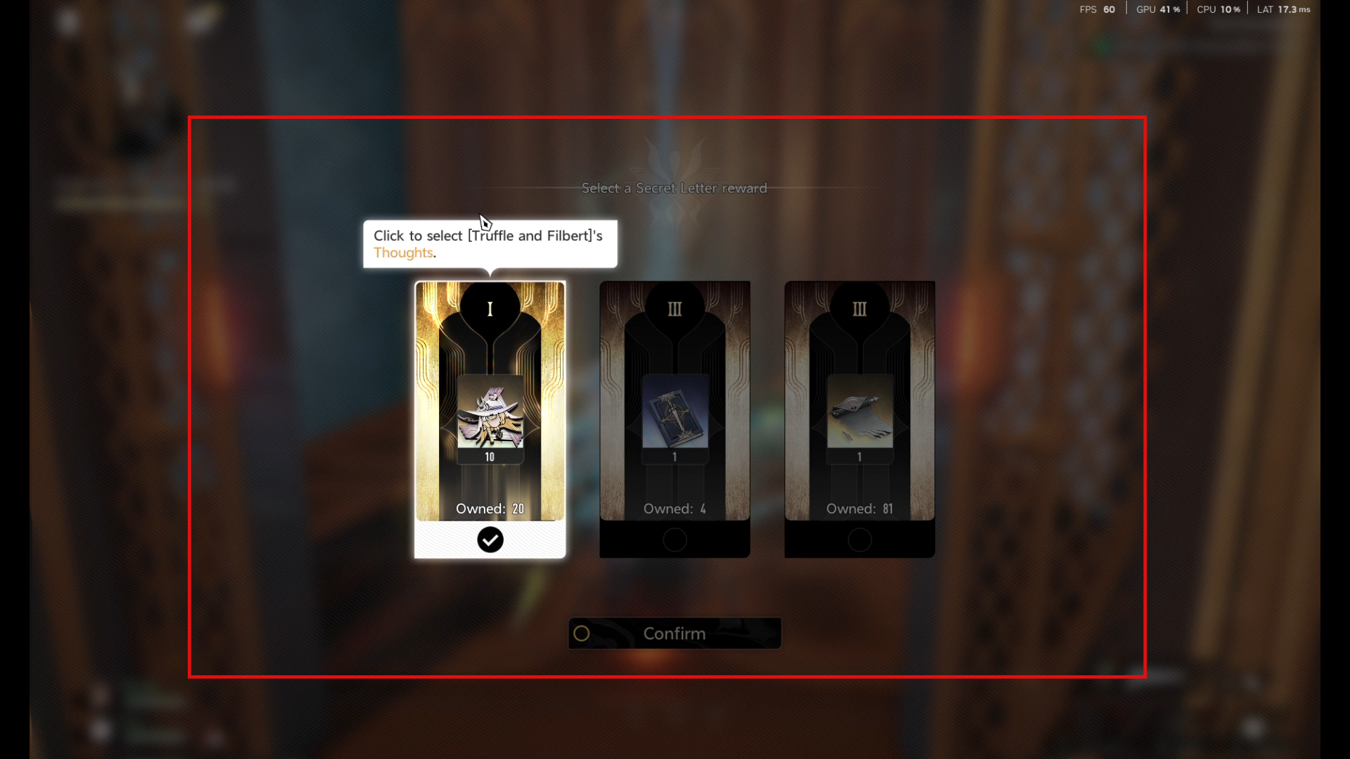 Complete the mission, then choose one reward from three options specific to that Secret Letter's reward pool.