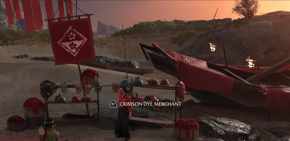 - The Crimson Dye Merchant appears only after starting a fire at the designated campsite along Stone Jaw Coast near Ishikari Plain.