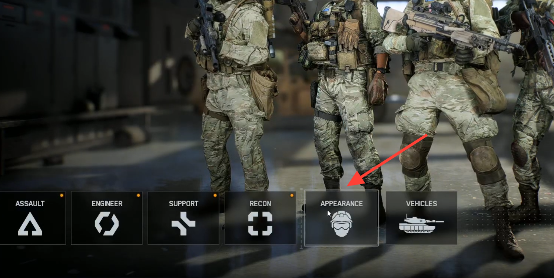 Choose one of the four soldier slots representing the classes (Assault, Engineer, Support, Recon) and the faction you want to customize.