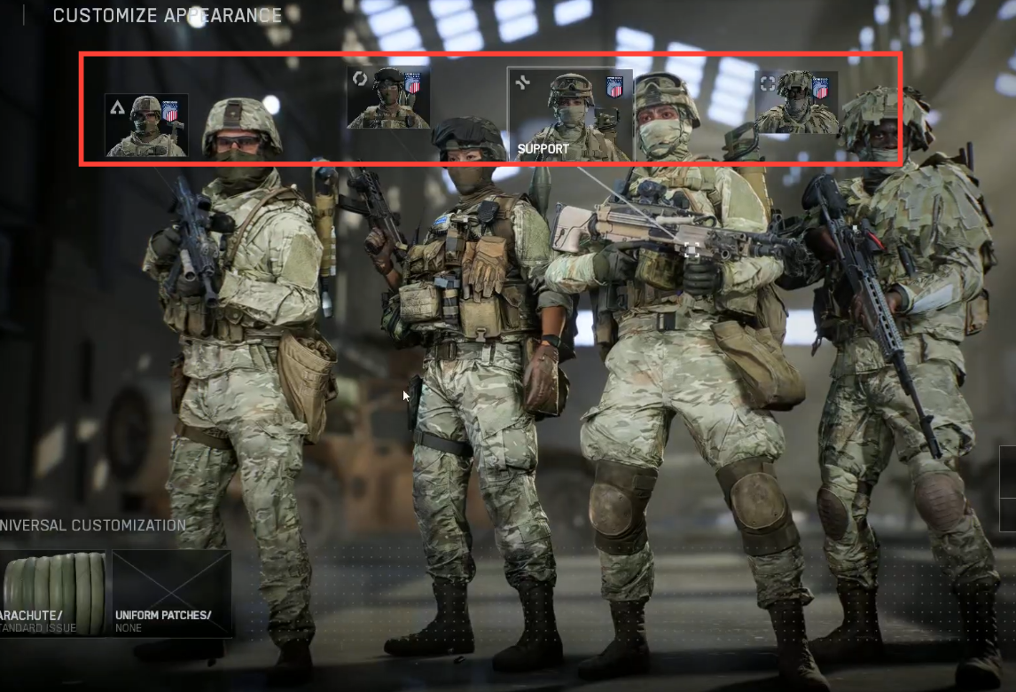 - Each class (Assault, Engineer, Support, Recon) has multiple soldiers with unique skins tied to faction and class.