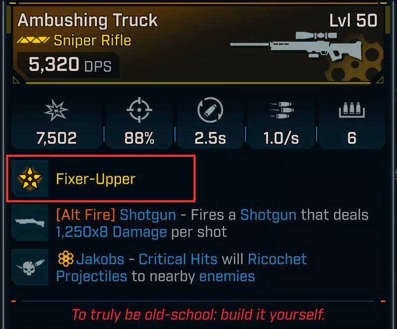 - The Fixer-Upper trait, featured on the legendary Jakobs Truck sniper rifle, triggers ricochet critical hits to nearby enemies for added chaos in fights.