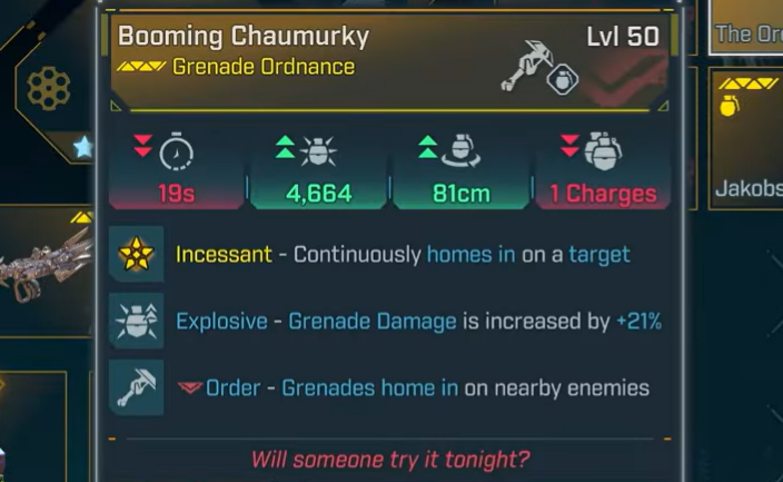 | Chaumurky | Grenade | Order | Persistent explosive that chains to nearby foes, dealing splash damage over time. | Common in pool; great for crowd control. |