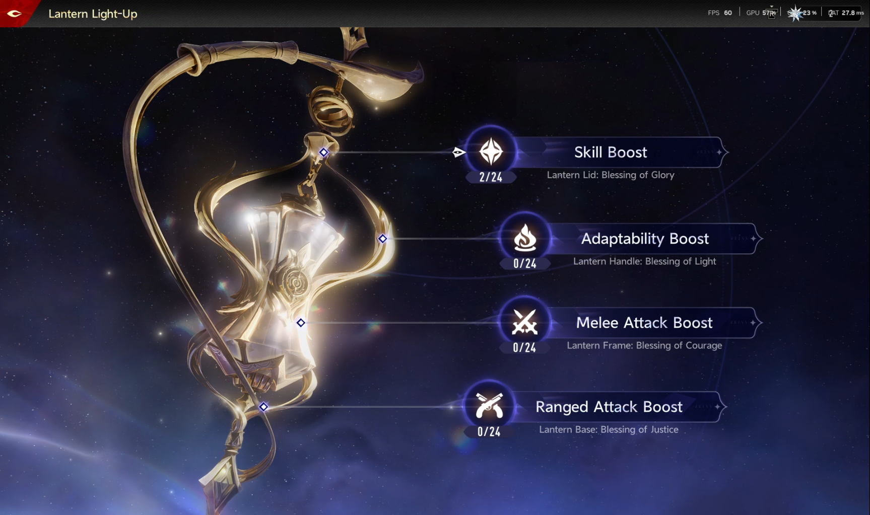 Each Mystic Maze run allows you to repair and upgrade your Lantern using Glazeystal that you get as a reward for every exploration in the Light-Up Lantern menu. These upgrades are divided into four distinct segments, each focusing on a different aspect of your character's capabilities: