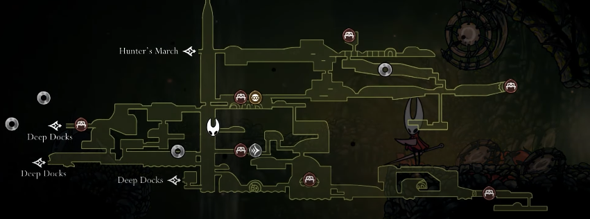 - Starting point: From the Deep Docks bench, head left past the Forge Daughter’s workshop. You’ll need to use the Drifter’s Cloak (obtained from the “Flexible Spines” quest) to glide over a series of molten pools.