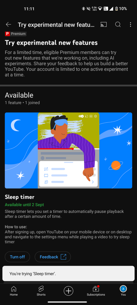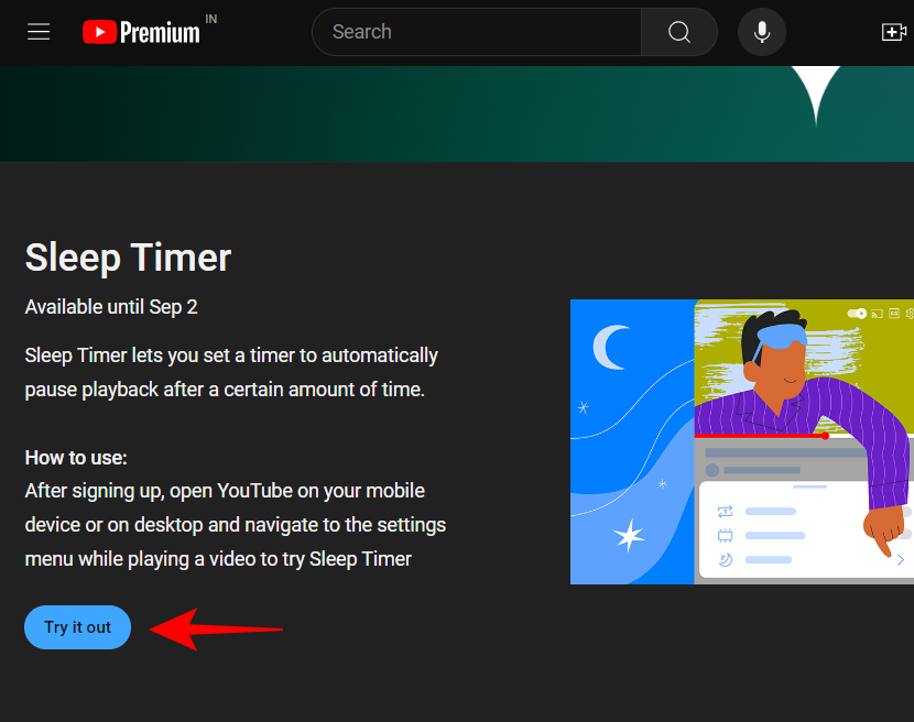 - If you’re a Premium user, enable the feature on desktop by going to youtube.com/new and clicking on Try it now under Sleep timer.