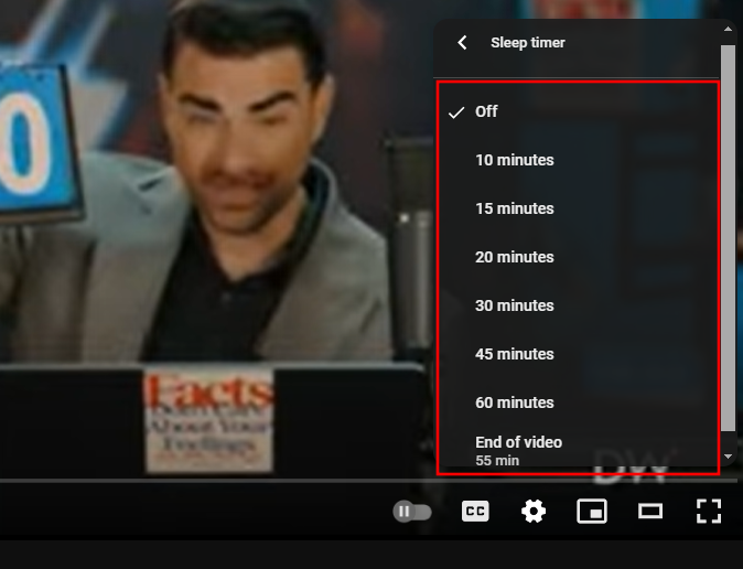 - You can set a sleep timer for the following lengths of time: 15, 20, 30, 45, and 60 minutes, as well as at the ‘End of video’.