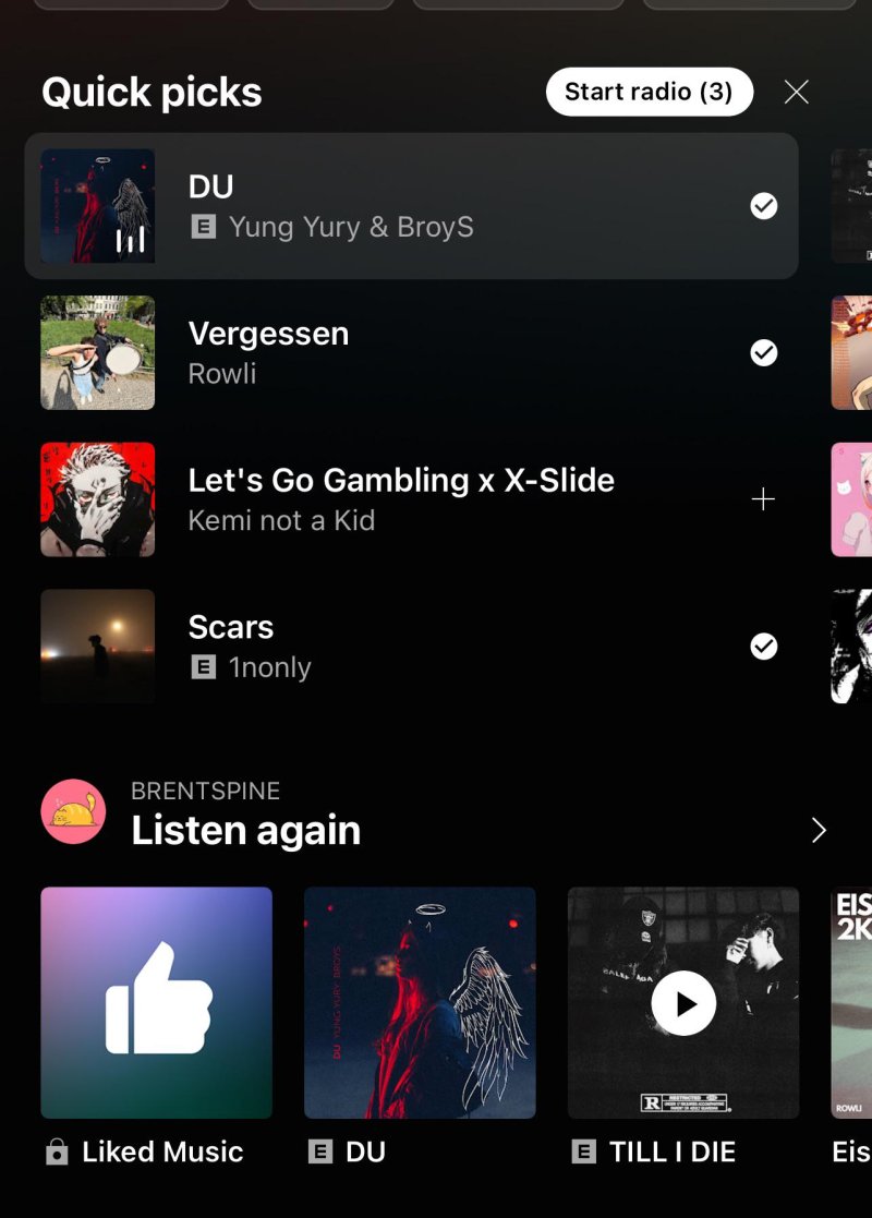 From the looks of it, you’ll be able to tap on the + icon next to your Quick pick songs, and then tap on Start radio to get started.