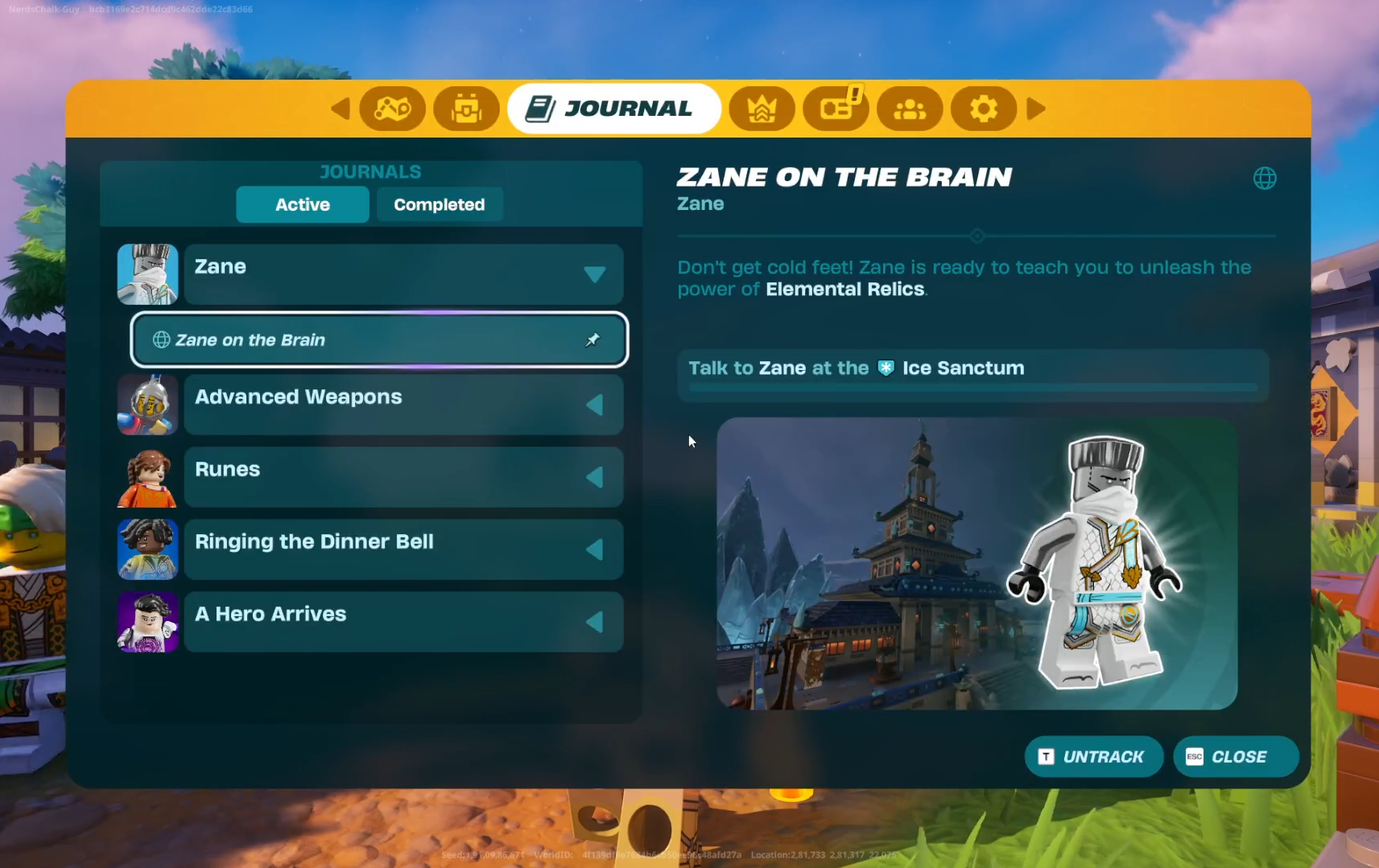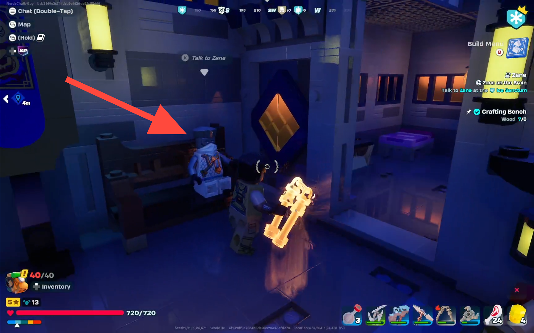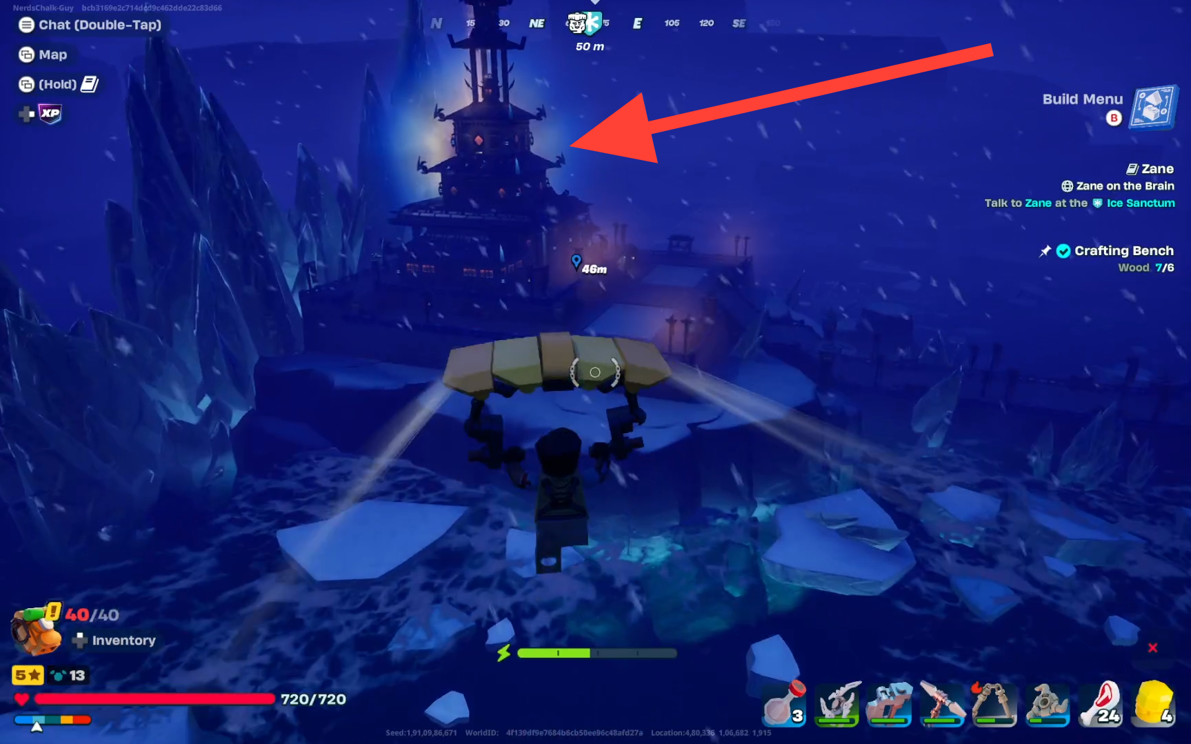 In the "Zane on the Brain" task in LEGO Fortnite Ninjago—head to the Ice Sanctum in the far north corner, mark it on your map, trek by foot and glider, then speak with Zane on the bench inside the Sanctum.