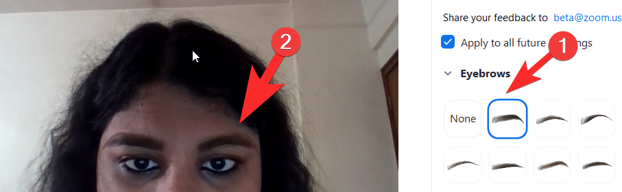 First, select the kind of eyebrow shape from the set of options provided. Zoom provides shapes like soft arch, thin arch, high arch, curved, straight, sharp, and fit straight. Click on the shape that you want.