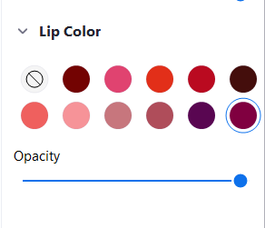 The final section allows the user to change the color of their lips. For lip-related customizations, you will only get color and opacity options.