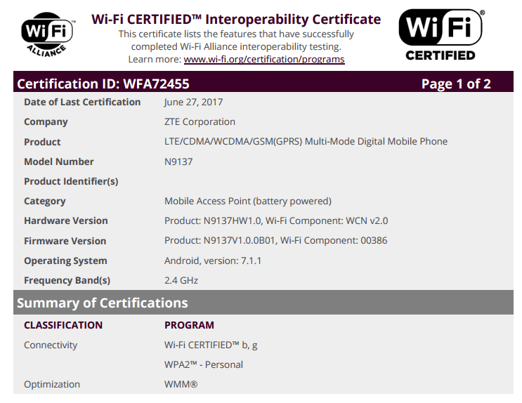 A couple of ZTE handsets bearing the model number Z852 and Z9137 have appeared on Wi-Fi Alliance hinting that they could be launched very soon.